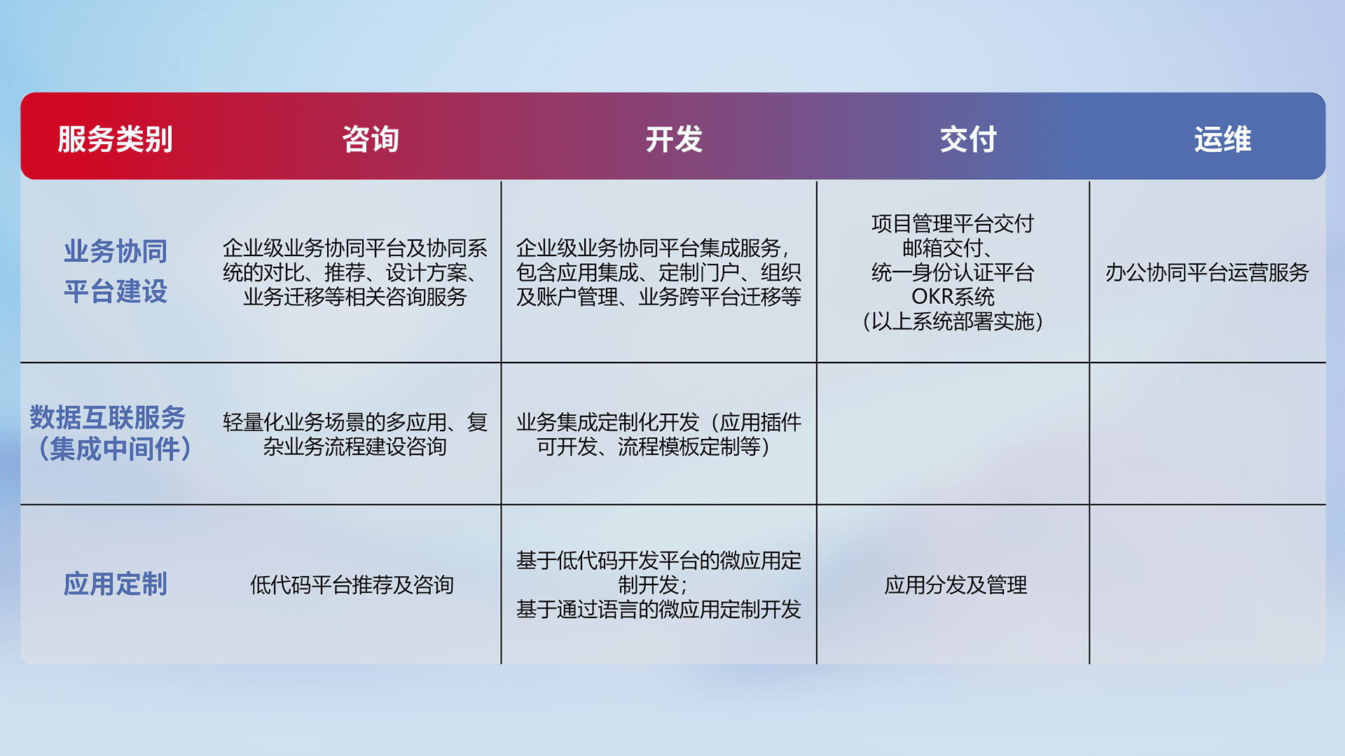 针对钉钉、、企微、、、IDaas等平台级产品提供产品的规划、、、、方案、、交付、、、、定制化开发等服务,,,实现如统一协同办公、、、、智能客户服务、、、、混合会议管理、、、、智能数据查询、、、等业务场景,,,实现数字化转型。。。。