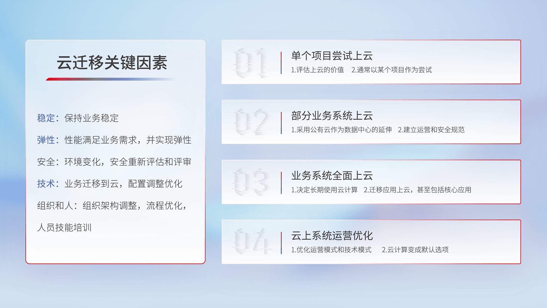 结合实际业务,,,,从规划设计、、、、云平台选型、、、、云原生改造、、、、数据迁移、、集成交付,,,,迁移全过程为客户识别最佳上云路径,,做好风险识别管理,,设计网络架构、、、身份权限、、、、安全审计合规、、、操作审计、、日志审计、、、监控告警策略、、、多站点容灾设计等,,,,对云上基础设施进行整体规划,,提升IT治理水平,,以满足弹性、、、高可用、、、高性能的需求。。。。