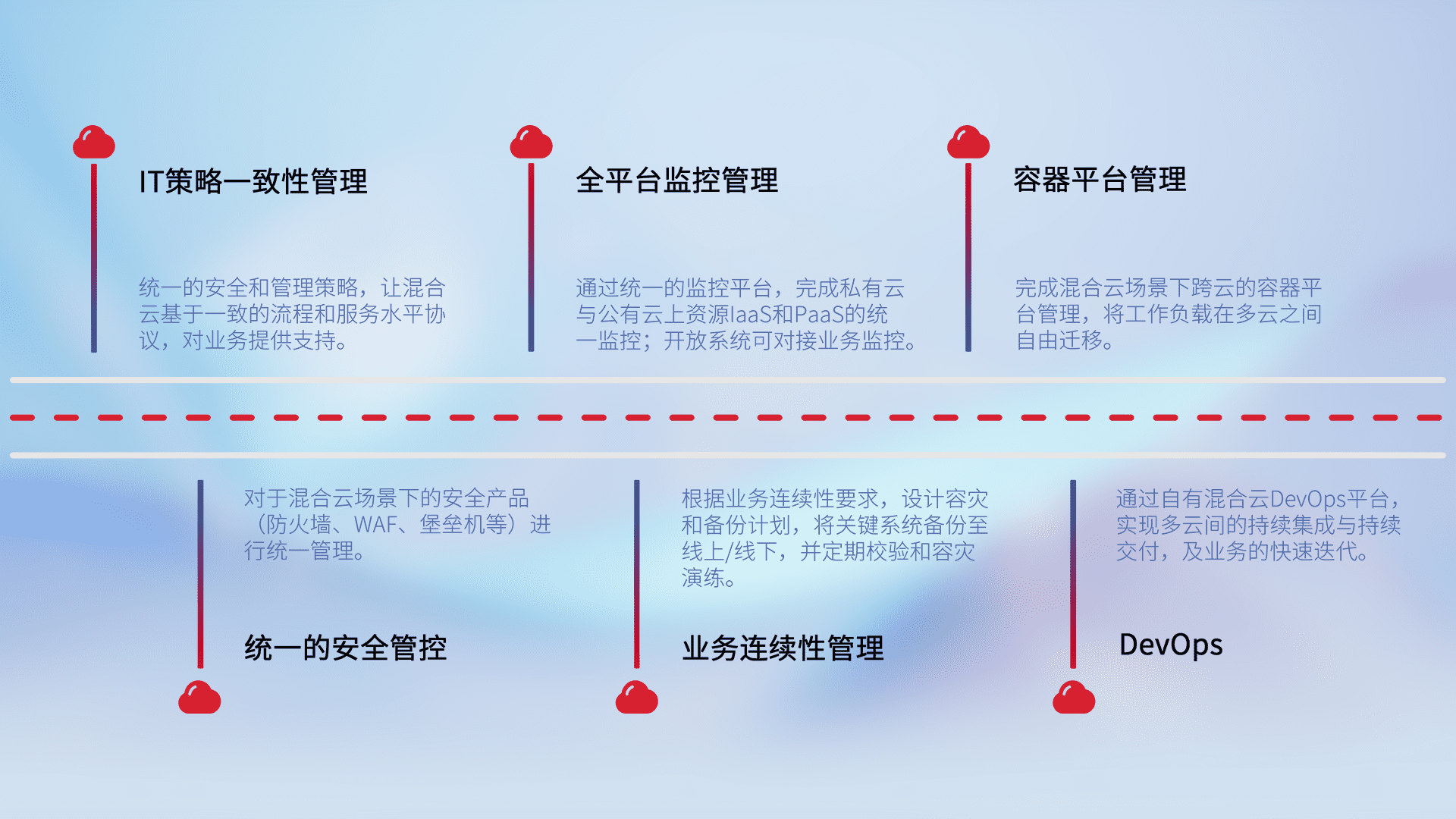 通过多云纳管,,,,以统一的资源数据模型把客户的云资源进行抽象和封装,,进而实现对多云资源的统一操作,,保障云资源管理的可靠性、、稳定性与可用性。。。。量身定制化运维内容,,配置、、、开发运维、、补丁管理、、备份、、、监控、、、、认证和访问管理、、、审计和日常巡检等,,,保障在用云过程中的可靠度,,,,稳定度以及高可用率。。